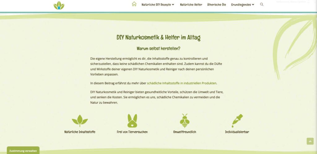 Das Thema habe ich gewählt, weil ich selbst auf alternative Gesundheits- und Hausmittel setze und hier meine persönlichen Interessen einfließen lassen konnte. Das Projekt wurde als Blog konzipiert – es handelt sich nicht um einen Shop oder Produktverkauf, sondern um eine inhaltlich geprägte Seite.