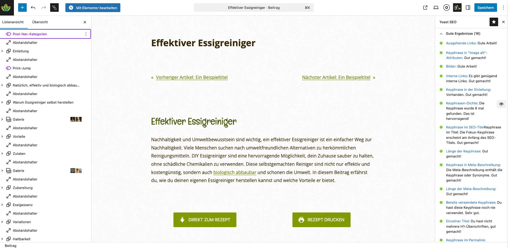 Für das Projekt habe ich verschiedene Plugins eingesetzt, u. a. YOAST zur Suchmaschinenoptimierung. Auch wenn das Tool nur an der Oberfläche kratzt, bietet es eine gute Basis für Struktur, Lesbarkeit und Keyword-Fokus – perfekt für den Einstieg. Ein Beispiel: Beim Beitrag Effektiver Essigreiniger habe ich alle SEO-Signale optimiert (grüne Bewertung), was im Screenshot deutlich sichtbar wird.