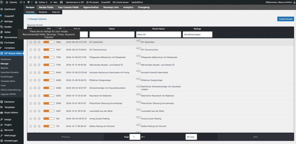 Für die Rezepte nutze ich das Plugin „WP Recipe Maker“, das Zutaten und Zubereitung übersichtlich darstellt.