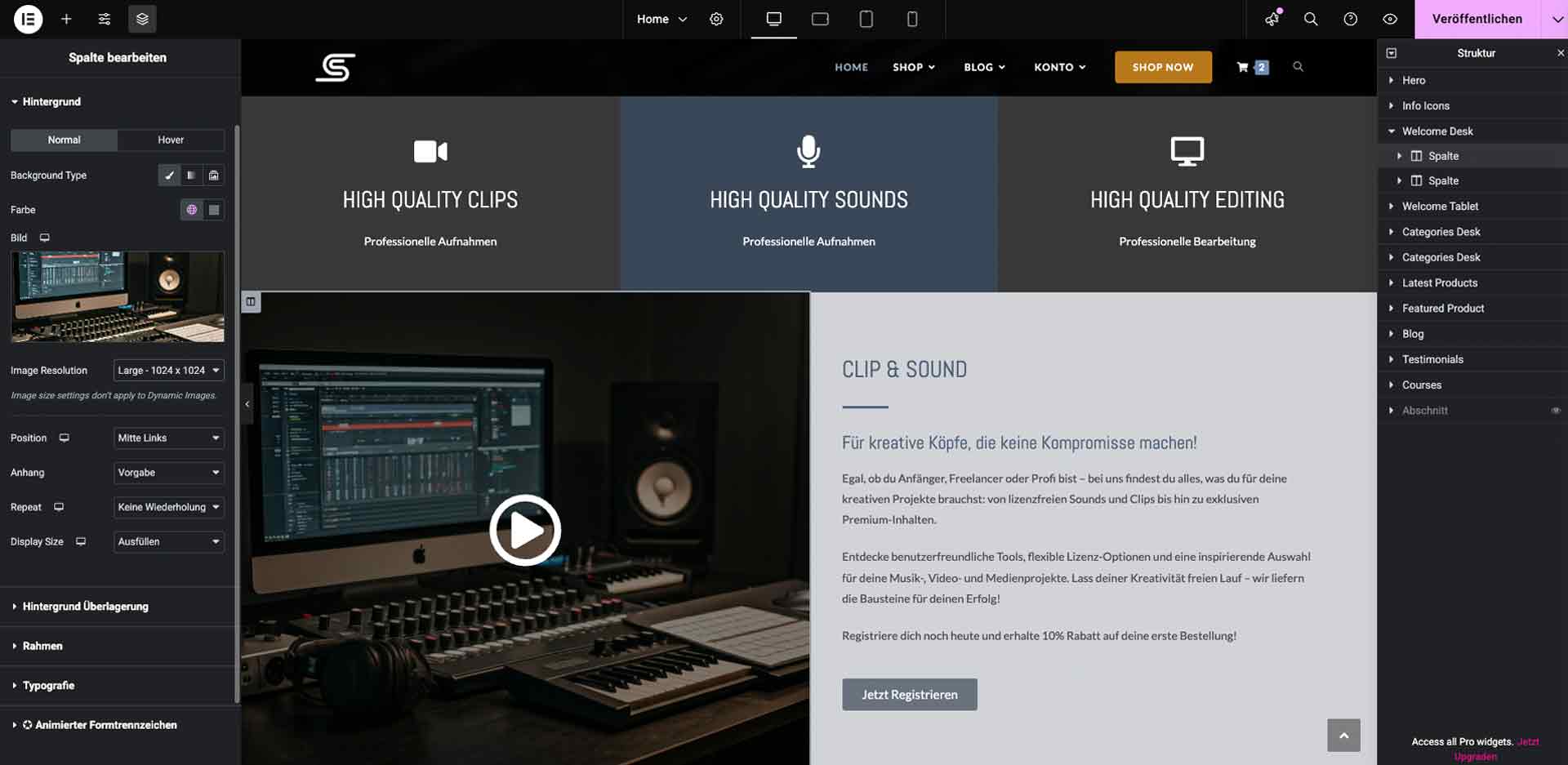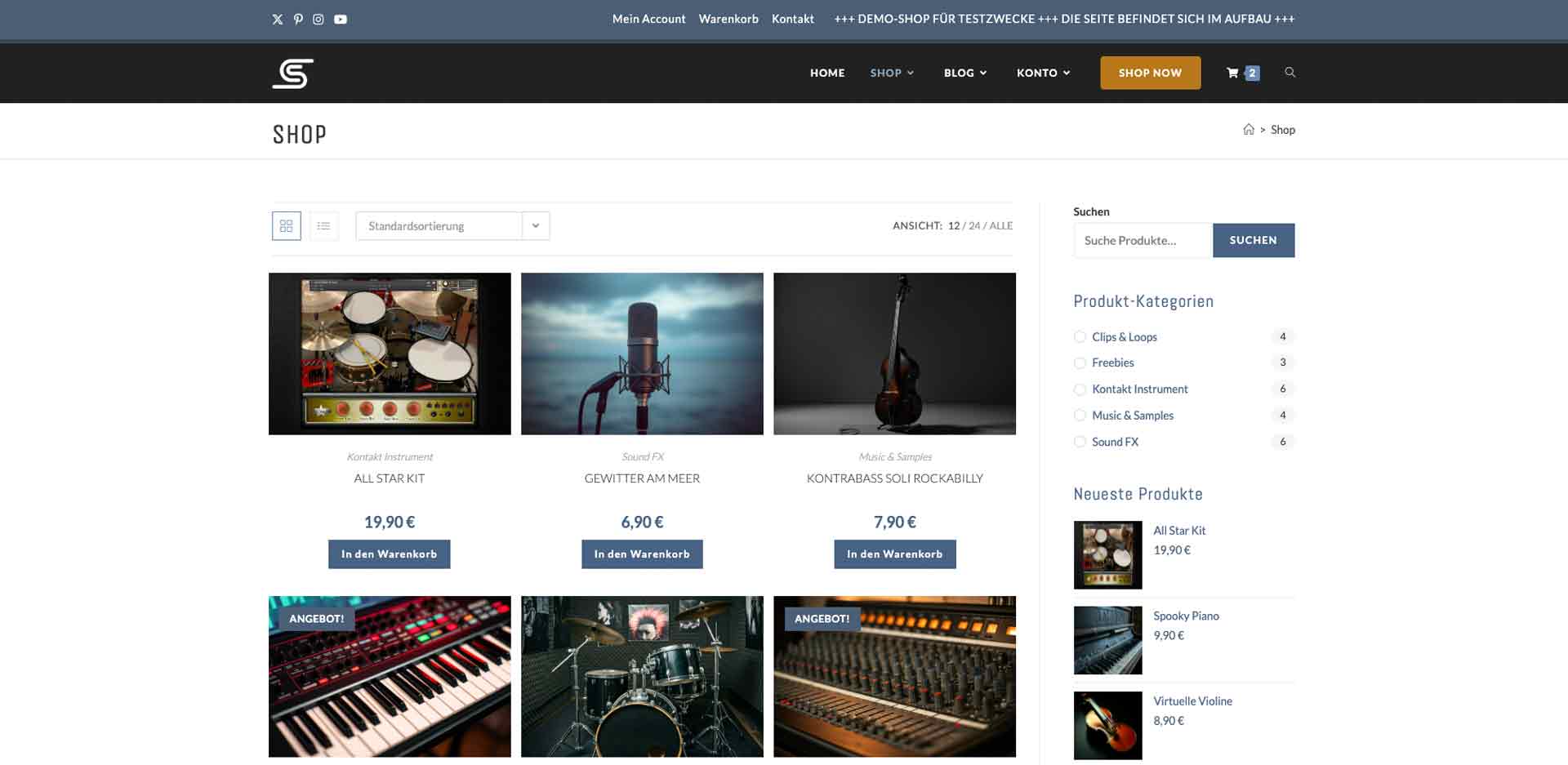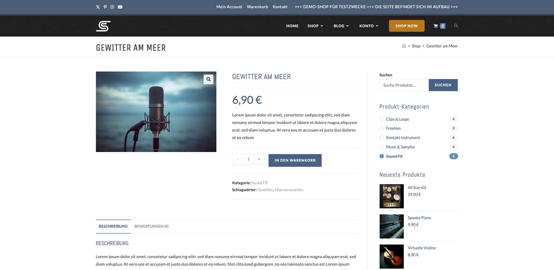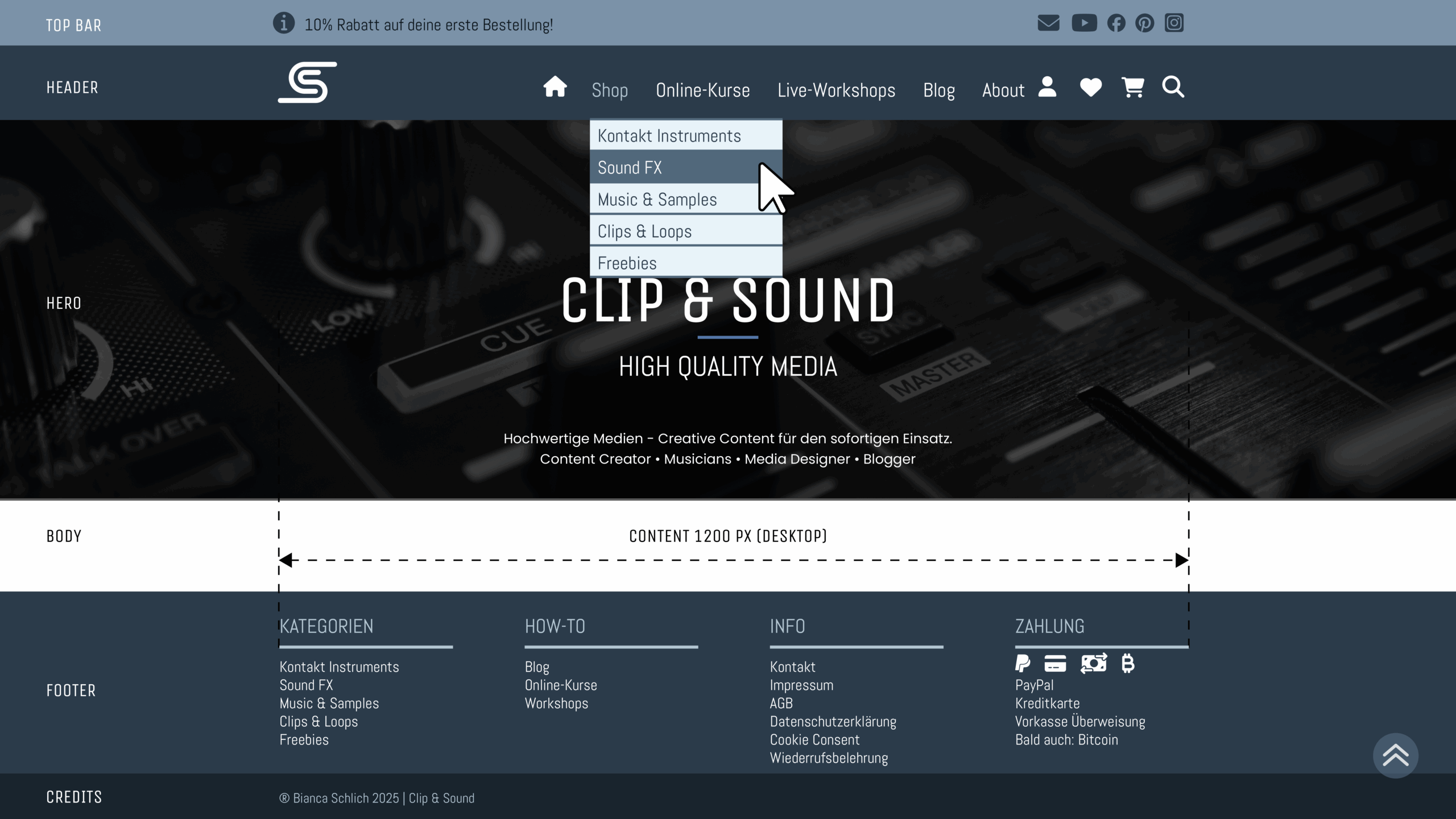 Auch wenn ich noch keine finalen Inhalte erhalten habe, habe ich den Shop – unter dem Namen „Clip & Sound“ – selbstständig mit Dummydaten gefüllt, um das Layout und die Struktur erlebbar zu machen.