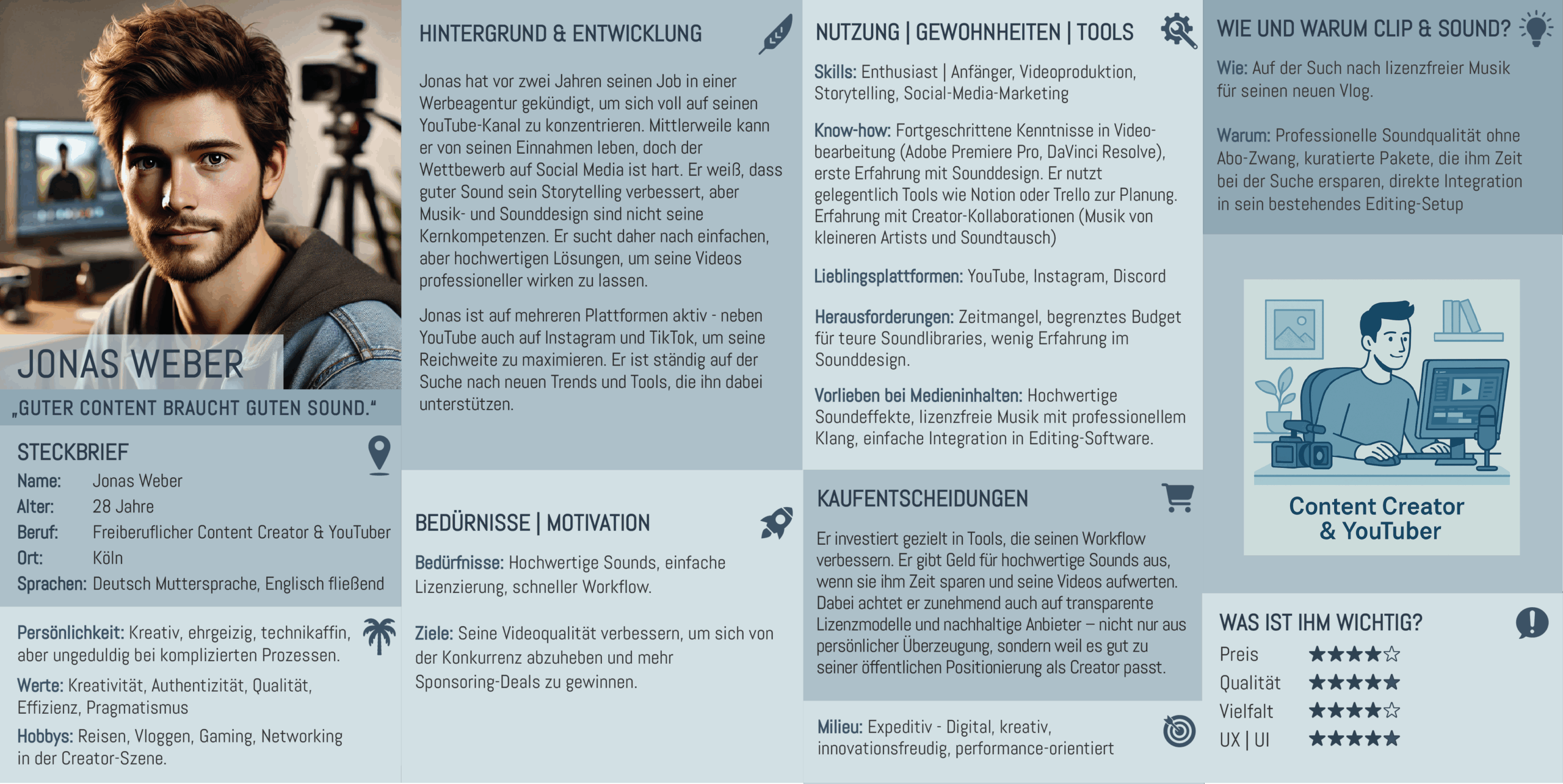 Hinter jeder Marke steht eine Geschichte – und diese Geschichte macht den Unterschied. Clip & Sound richtet sich an Content Creator wie Jonas, die sich mit hochwertigem Sound von der Masse abheben wollen. Doch der Weg zu professionellem Audio ist oft kompliziert: Lizenzrechte, unübersichtliche Soundbibliotheken und zeitaufwendige Recherchen bremsen den kreativen Flow.