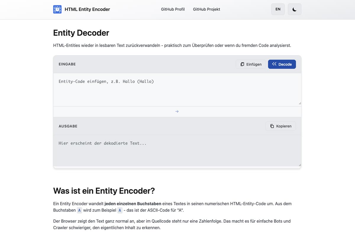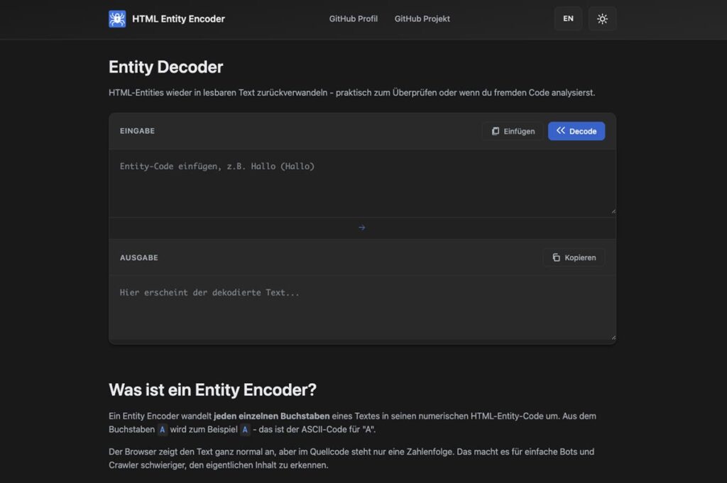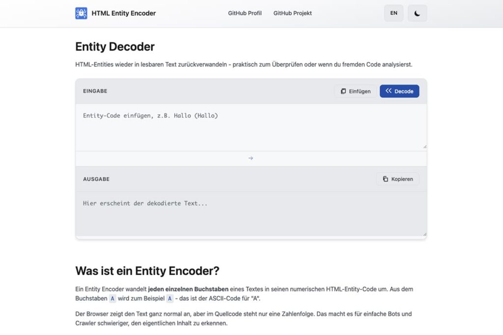 Daraus entstand dieses minimalistische Tool zur Umwandlung von Text in HTML-Entities – umgesetzt mit reinem JavaScript und ohne zusätzliche Libraries.