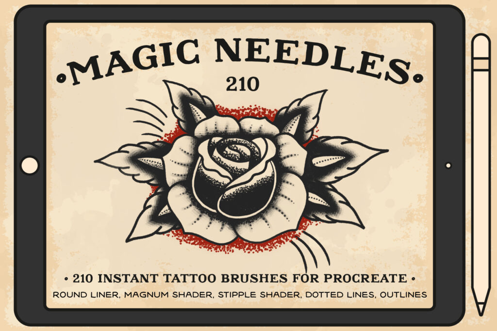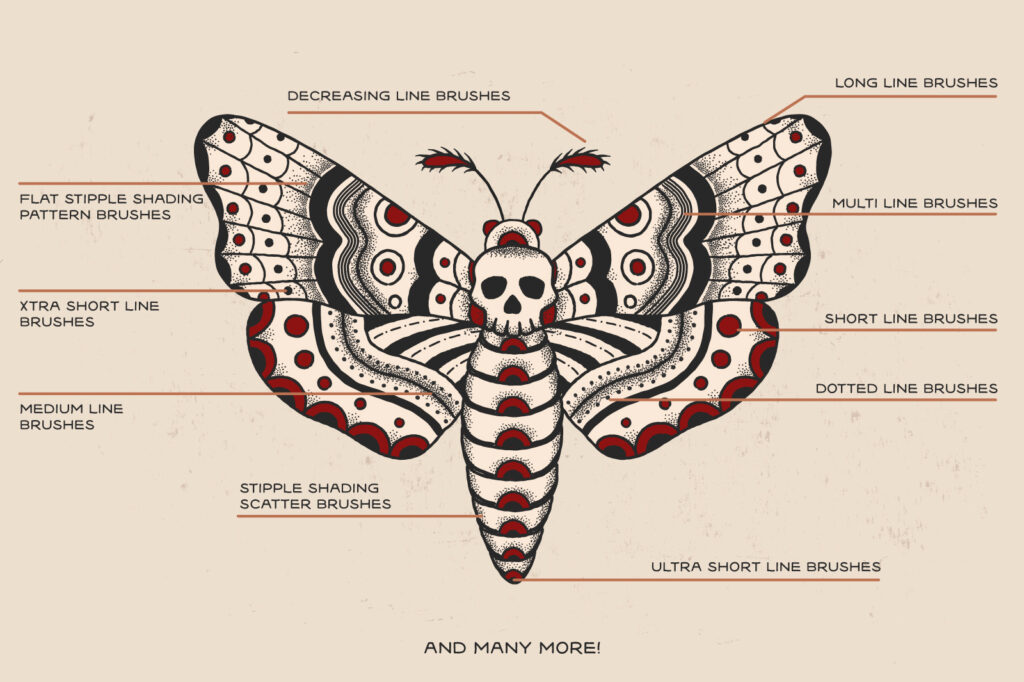 Brushes, die sowohl für klassische Tattoo-Optik als auch für experimentelle Layouts einsetzbar sind. Schneller umzusetzen, als Fonts, aber mit dem Anspruch, immer den „eigenen Strich“ einzubringen.