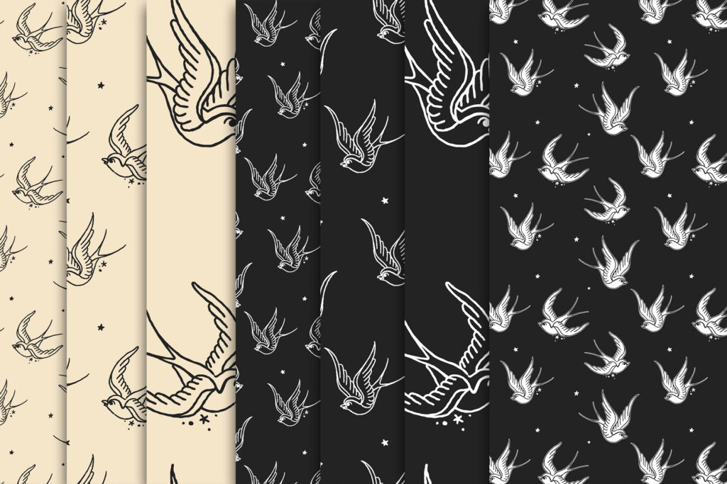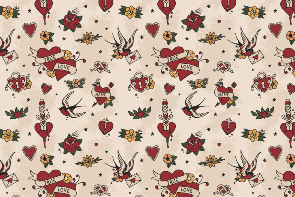 Ich entwickle nahtlose Muster und Grafikelemente, die sich flexibel kombinieren lassen – von klassischen Tattoo-Motiven bis zu modernen, punkigen Layouts. So entstehen Sets, die vielseitig einsetzbar sind und meinen Stil klar transportieren.