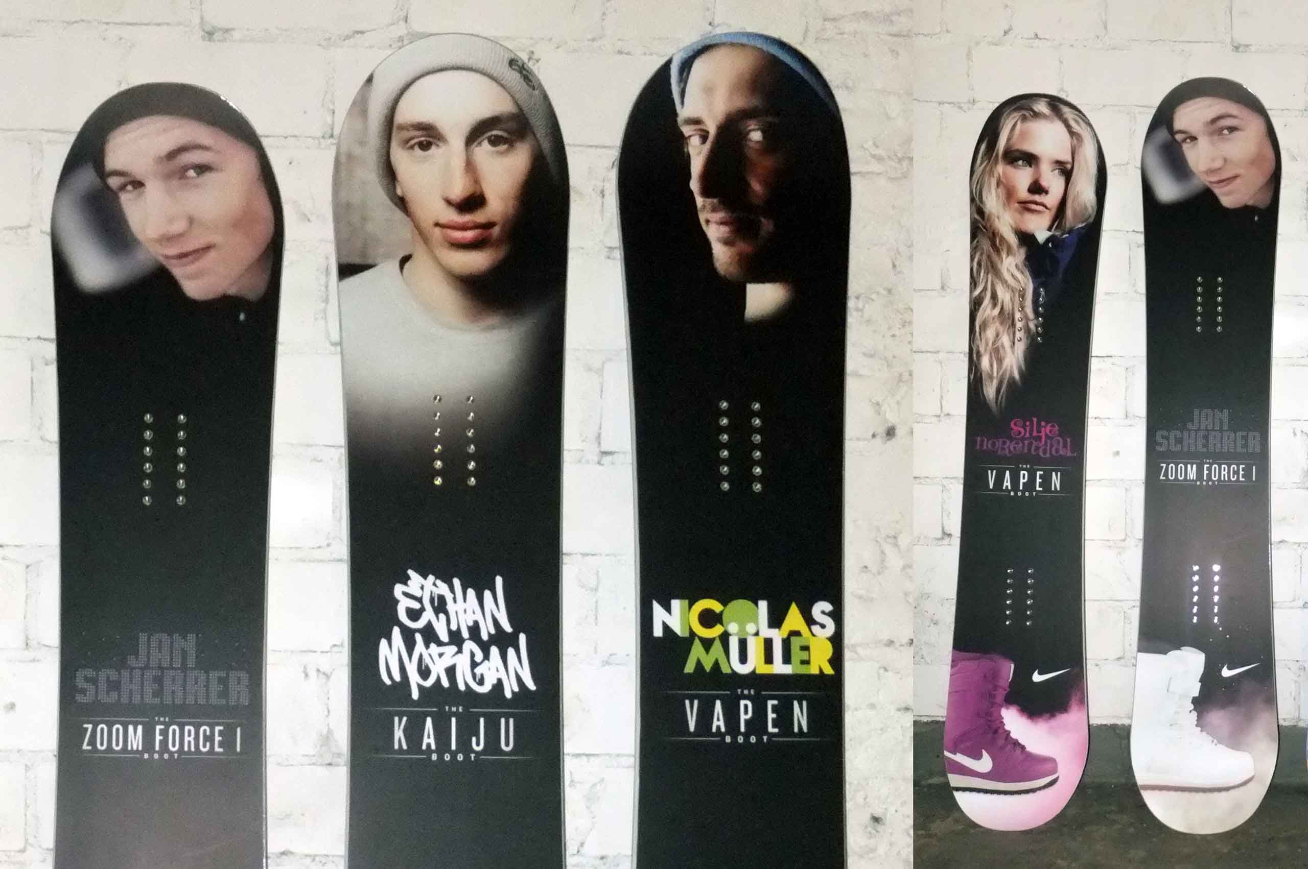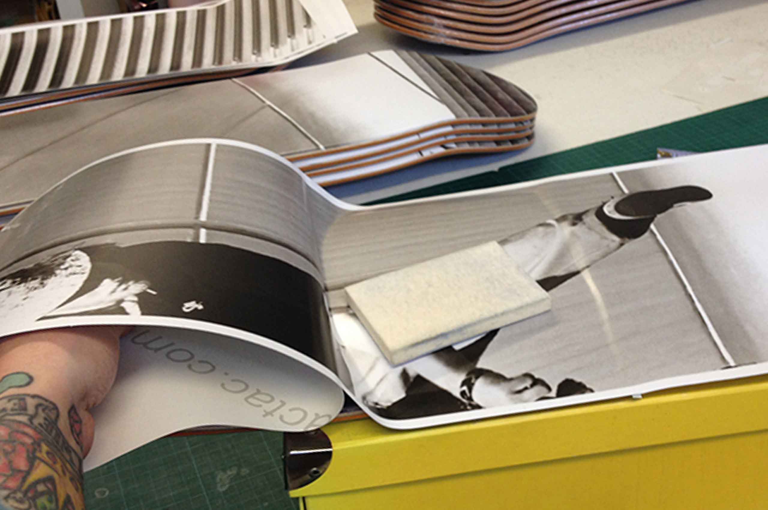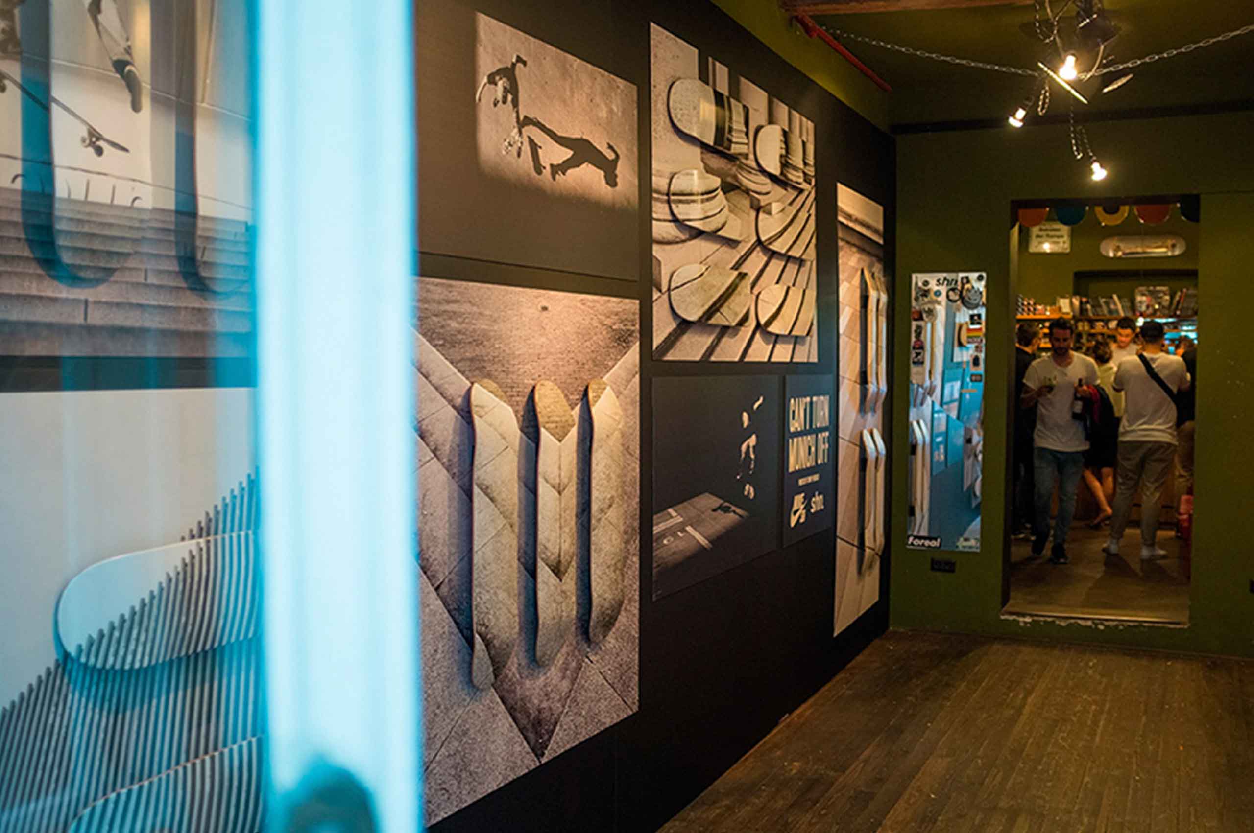 - Beeindruckende Ausstellung der kaschierten Skateboard-Decks, bei der die Motive durch die Montage auf konturgeschnittenen Forex-Platten in 3D hervorgehoben wurden.