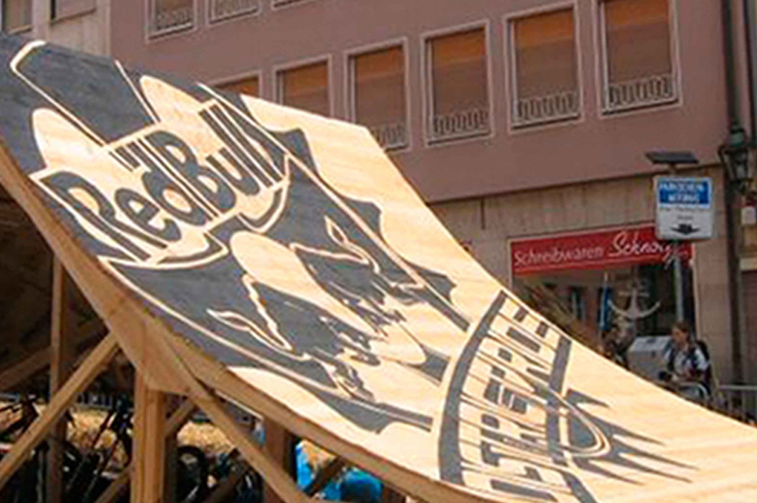 - Präzision bei ungewöhnlichen Materialien (Styropor für Water-Gap, kaschierte Skateboard-Decks, konturgeschnittene Forex-Logos).